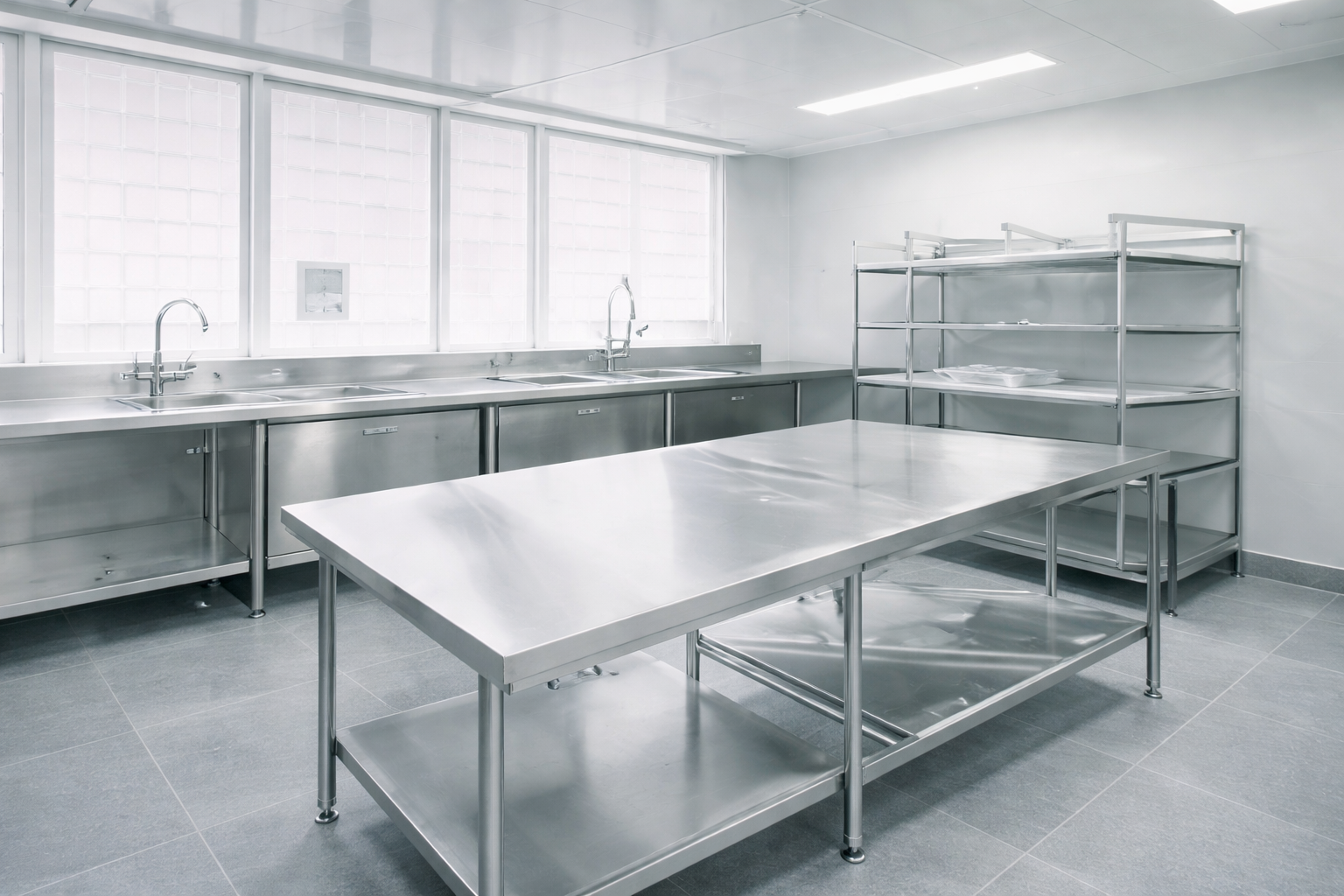 Mesas, tarjas, anaqueles y mobiliario fabricado en acero inoxidable de alta resistencia para cocinas industriales y áreas de preparación.